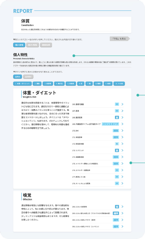 400項目の検査数を活かして、日常で気になる項目に関連した遺伝的項目を1つのページに集約。