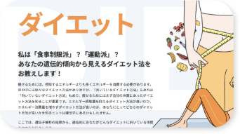 「ダイエットと遺伝子」「美肌と体質」「栄養素の吸収特性」「スポーツ適性」など、生活に密接に関わるテーマごとに関連遺伝子情報をピックアップ。専門的な知識がなくても、自分の生活にどう取り入れればいいかがひと目でわかる構成になっており、実践的で楽しく学べるパーソナルコンテンツとして好評です。