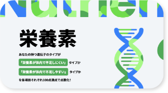 栄養素に関連する81の遺伝子を解析し、遺伝的に不足しがちな栄養素の傾向や、おすすめの食品がわかります。